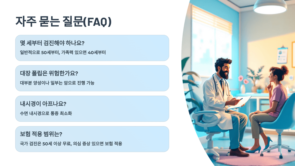 대장내시경은 용종이나 암세포를 직접 확인하는 가장 정확한 방법이에요. 50세 이상은 5~10년마다, 가족력이 있다면 40세부터 받으세요.