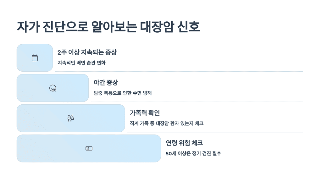 대장암 초기 증상은 미묘하지만, 자가 진단으로 위험 신호를 잡아낼 수 있어요. 아래 체크리스트로 확인해보세요.
