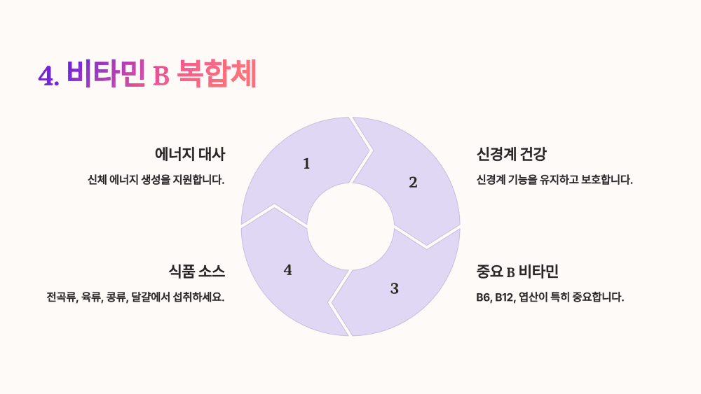 4. 비타민 B 복합체 에너지 대사 촉진, 우울감 감소 및 스트레스 관리, 피로 해소