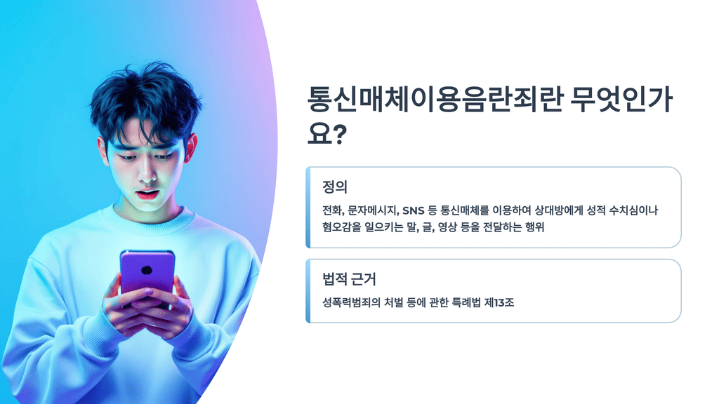 통신매체이용음란죄(이하 통매음)는 성폭력범죄의 처벌 등에 관한 특례법 제13조에 따라, 자기 또는 타인의 성적 욕망을 유발하거나 만족시킬 목적으로 전화, 컴퓨터, SNS 등 통신매체를 통해 성적 수치심이나 혐오감을 일으키는 말, 글, 영상 등을 상대방에게 전달하는 행위를 처벌하는 범죄입니다. 예를 들어, 카카오톡으로 음란한 메시지를 보내거나 게임 채팅에서 성적인 모욕을 하는 경우가 이에 해당해요.