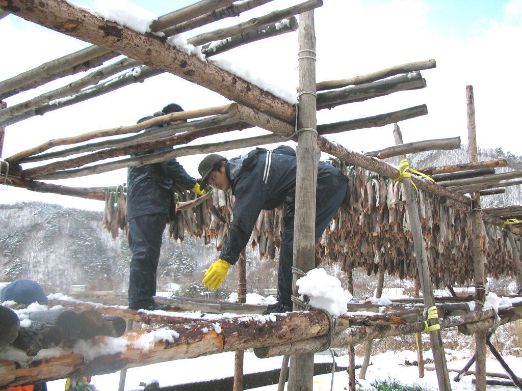 - 덕장의 설치가 끝난 뒤에는 2차 냉동보관 된 명태를 용대리로 옮겨와 날씨가 영하로 내려간 날을 택하여 명태를 걸고 저녁에 동결되지 않으면 최종 황태 상품의 질이 현격히 떨어지기 때문에 상덕 시기를 선택하여야 합니다.