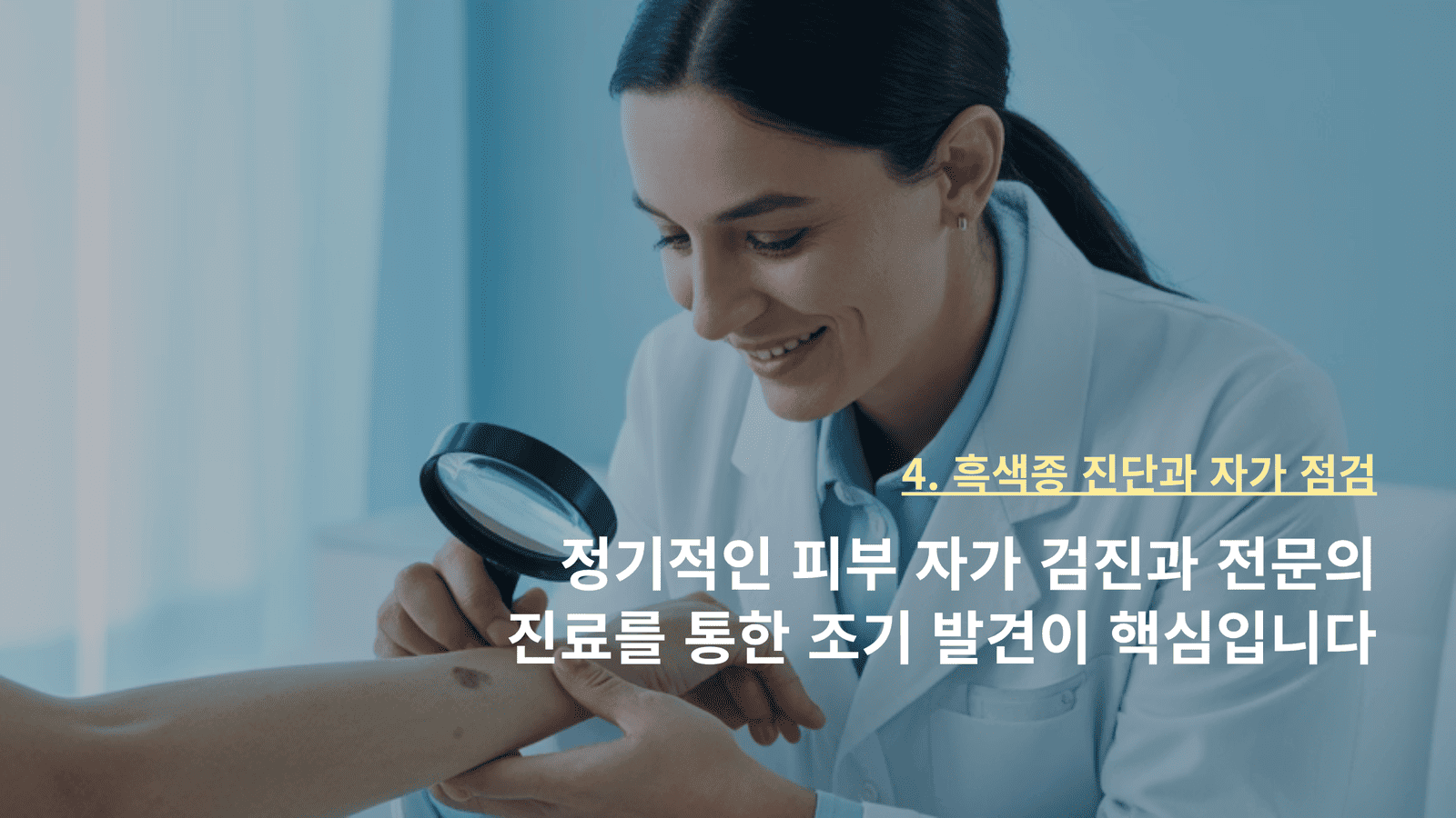 피부과 전문의는 더모스코프와 조직 검사를 통해 흑색종을 확진합니다. 조기 발견 시 생존율이 99%에 달하더라고요.
